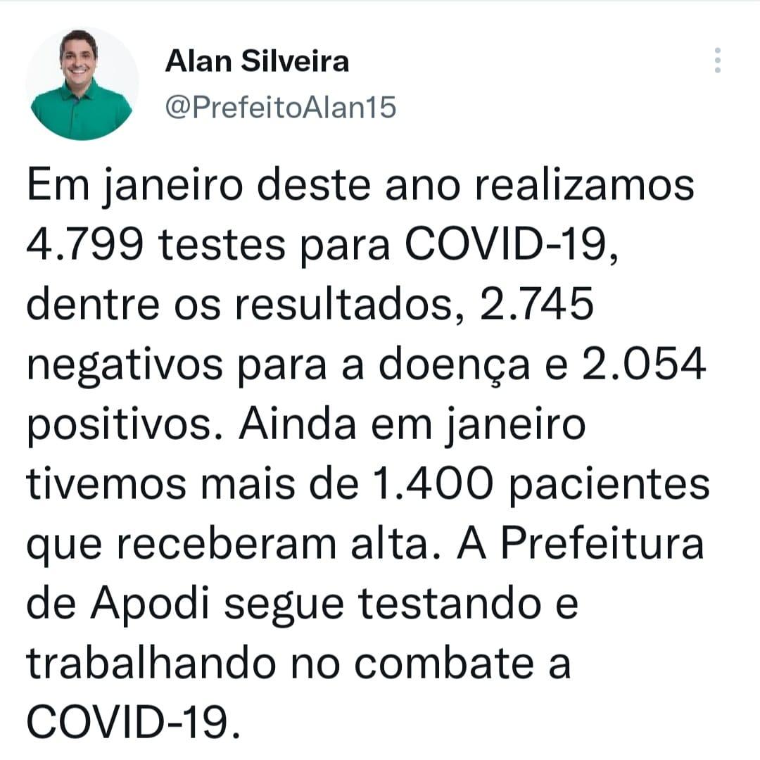 Na publicação, o atual prefeito divulgou que a secretaria de saúde realizou cerca de 4.799 testes para o coronavírus apenas no mês de Janeiro. Desta forma, esse número representa cerca de 13,36% da população apodiense.