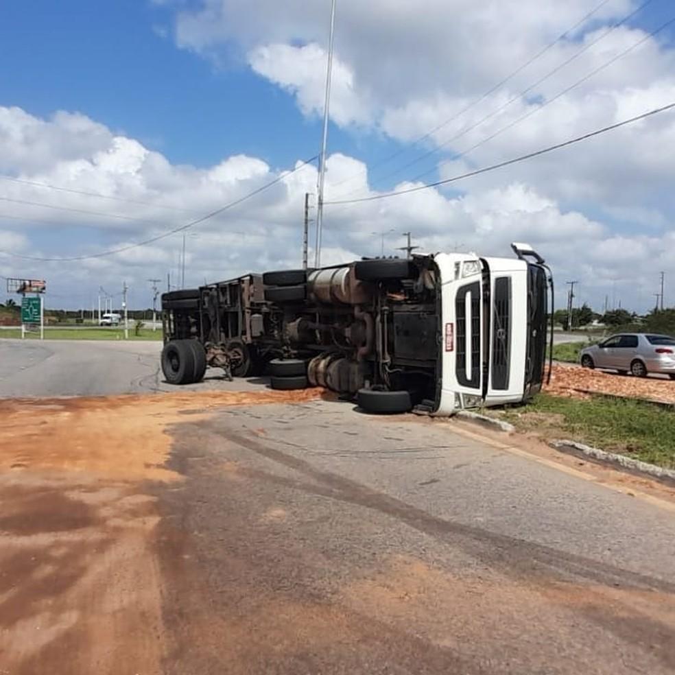 Uma carreta carregada de pedaços de madeira tombou, na manhã desta sexta-feira (17), na rotatória da pista que dá acesso ao Aeroporto Internacional de São Gonçalo do Amarante, na Grande Natal.