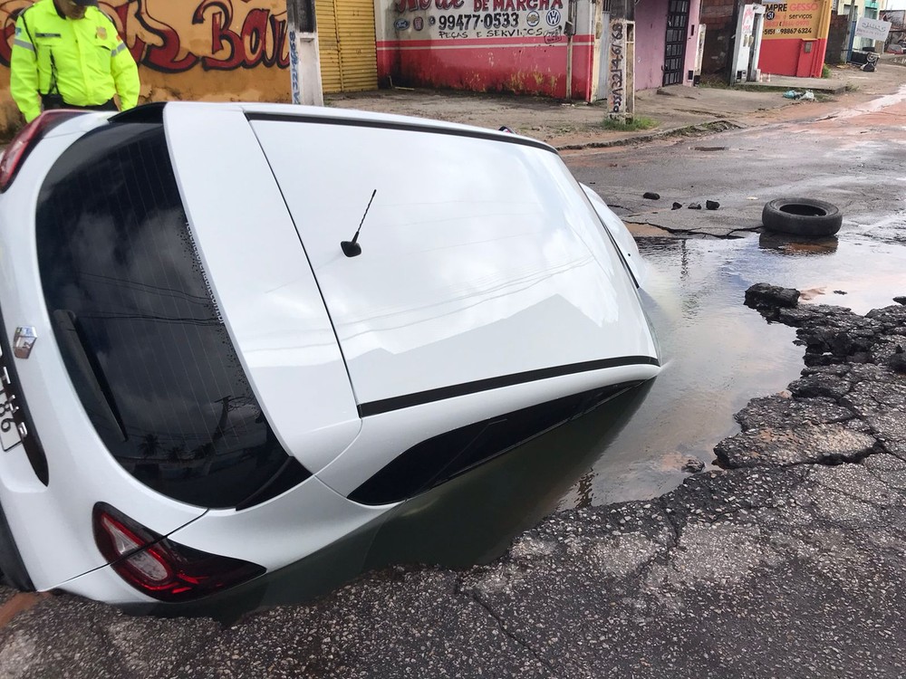 Um carro foi "engolido" por um buraco que se abriu na manhã desta segunda-feira (16) em uma avenida no bairro Igapó, na Zona Norte de Natal.