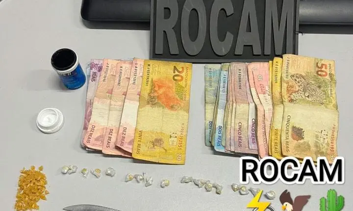 Os dois são suspeitos de tráfico de drogas. A equipe da Rocam estava em patrulhamento na rua Antônio Reis, naquela localidade, quando abordou um homem e uma mulher que estavam em uma residência abandonada e na revista aos dois foi encontrada uma certa quantidade de drogas tipo Crack e dinheiro fracionado.