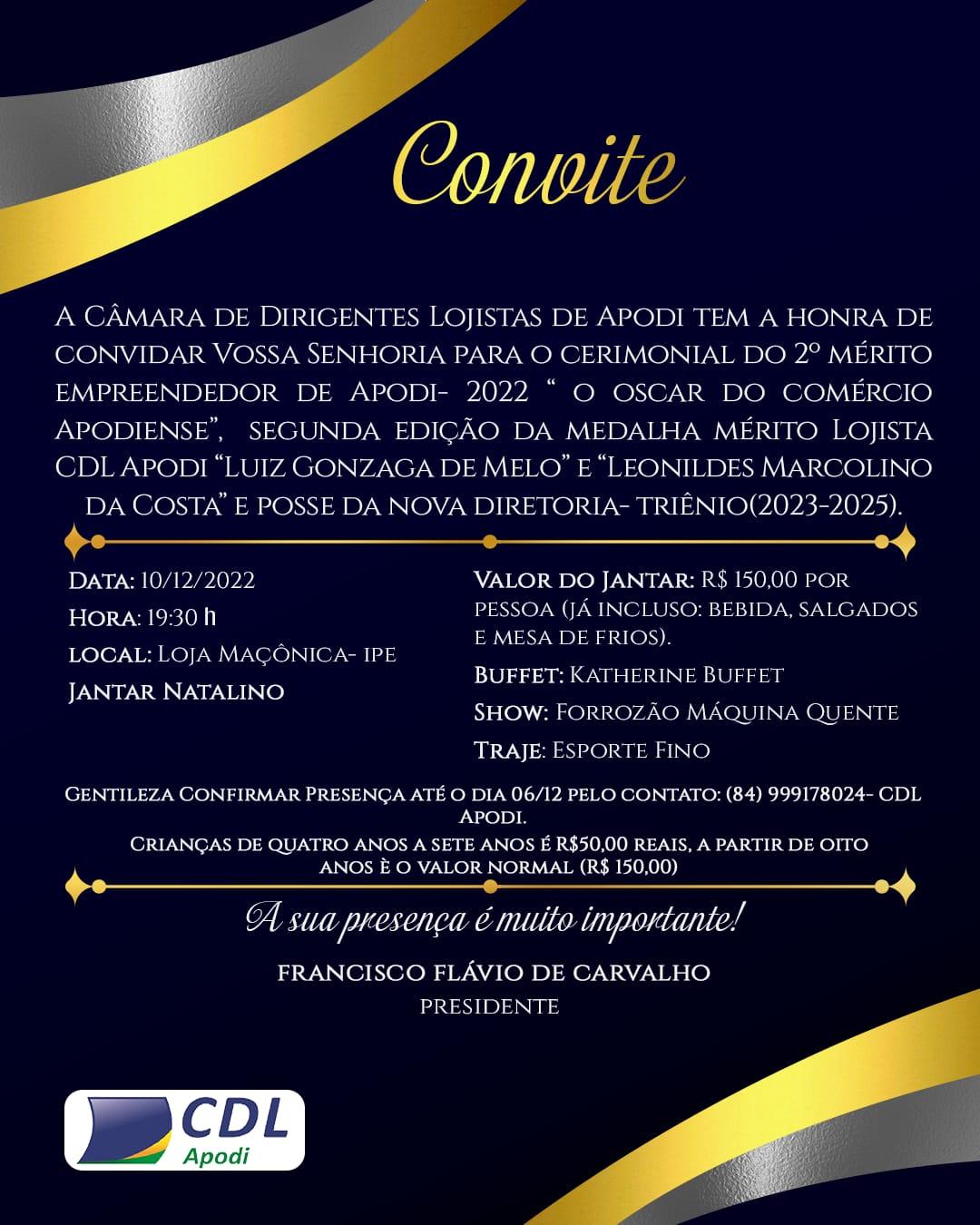 Neste Sábado(10), a Câmara de Dirigentes Lojistas (CDL) de Apodi, irá realizar os cerimoniais de premiação do 2º Mérito Empreendedor de Apodi - 2022 "O Oscar do Comércio Apodiense", bem como da Segunda Edição da Medalha Mérito Lojista CDL Apodi "Luiz Gonzaga de Melo" e "Leonildes Marcolino da Costa".