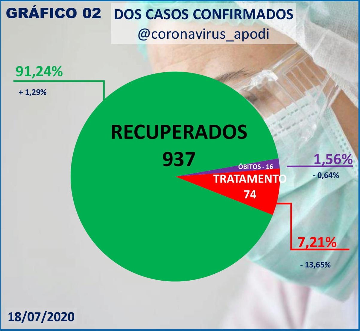 No último Boletim Epidemiológico deste Sábado(18), constam, dos 1027 infectados, 937(91,24%) já estão curados, 74(7,21%) estão em tratamento contra 16(1,56%) óbitos.