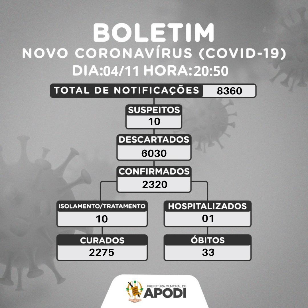 Com estatísticas baseadas nos dias 03 e 04 de novembro, houve um aumento de 5 pessoa confirmadas, totalizando 2320 casos, 5 pessoas foram curadas do novo Coronavírus, e há 1 caso em internação.