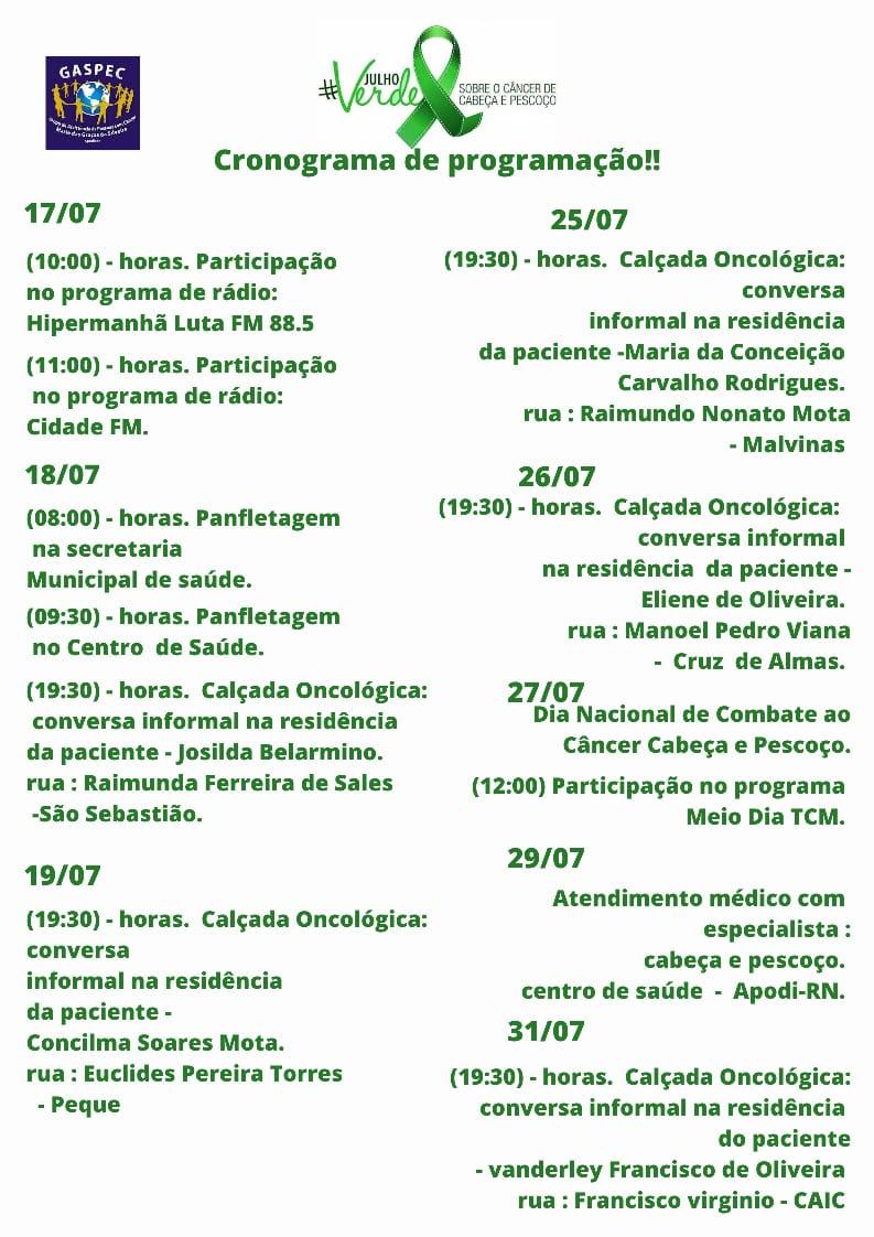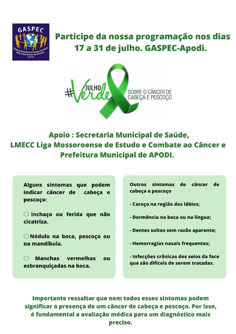 O GASPEC de Apodi, com apoio da Secretaria Municipal de Saúde, Liga Mossoroense de Estudo e Combate ao Câncer (LMECC) e Prefeitura Municipal, promoverá o Julho Verde sobre Câncer de Cabeça e Pescoço.
