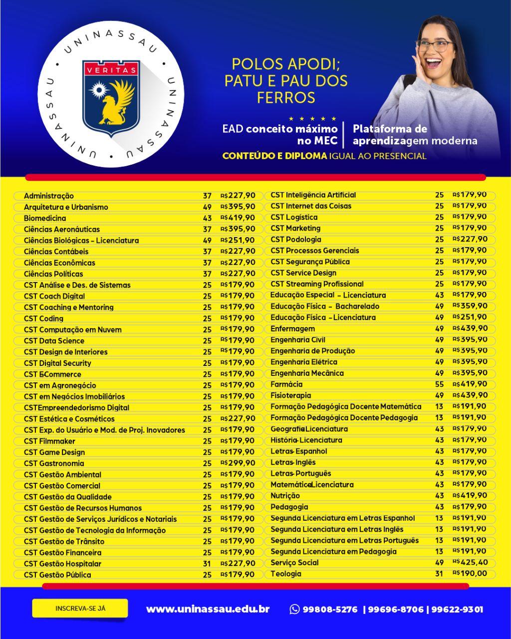 Com a UNINASSAU você tem os melhores descontos e mensalidades para cursar seu curso de nível superior.