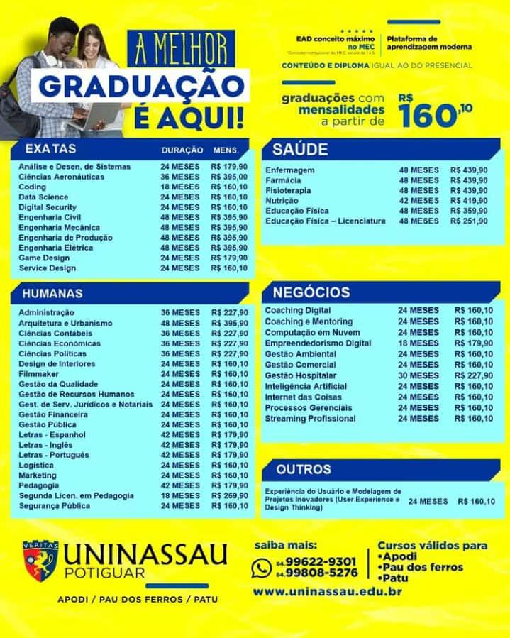 Com a UNINASSAU você tem os melhores descontos e mensalidades para cursar seu curso de nível superior.