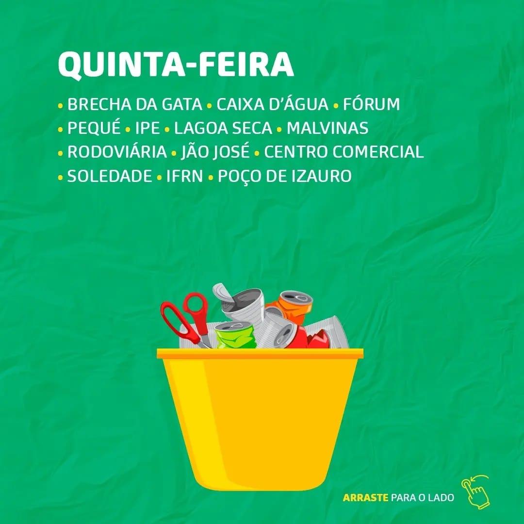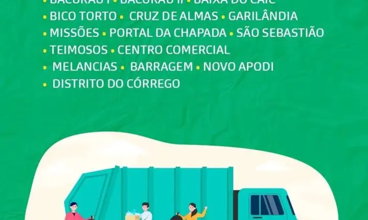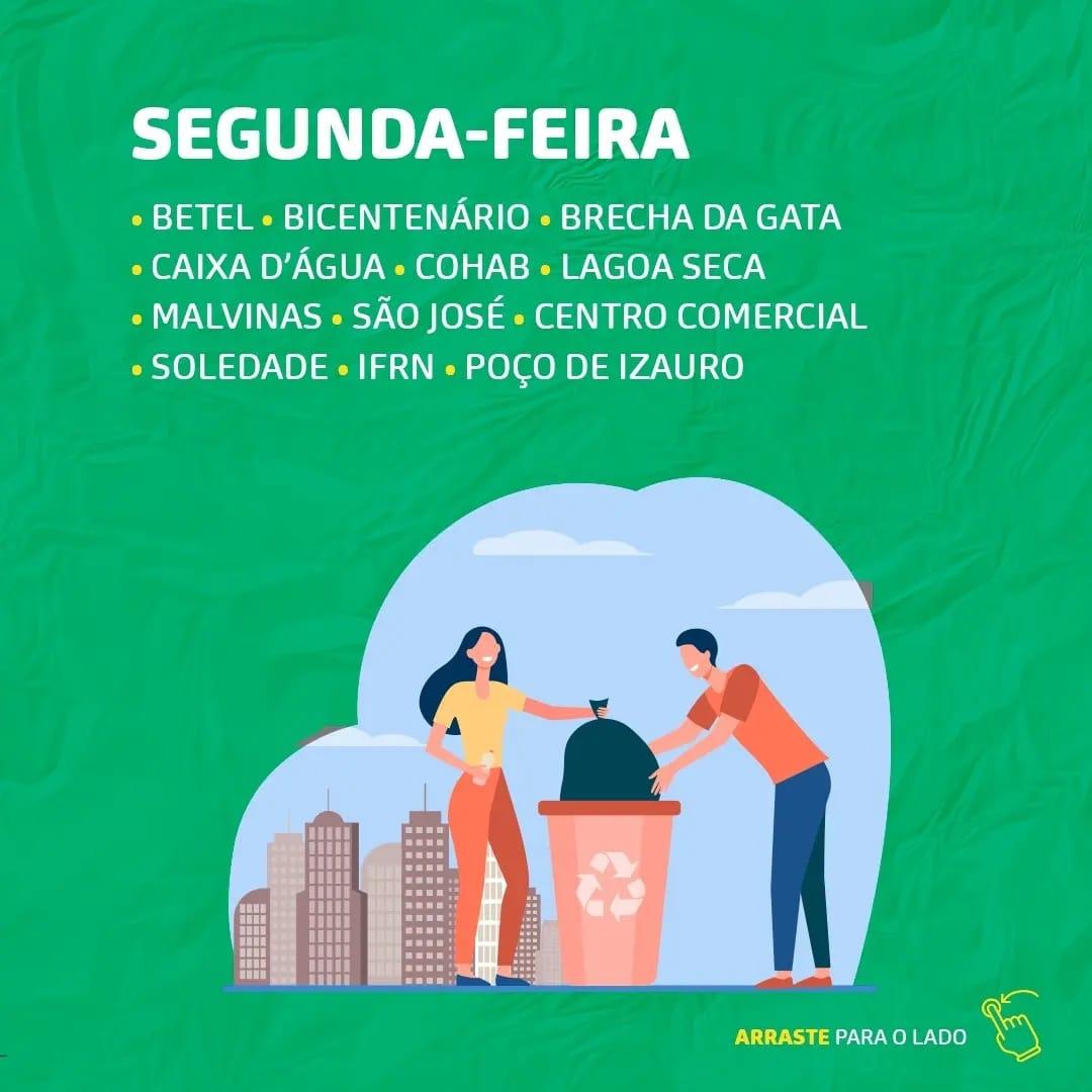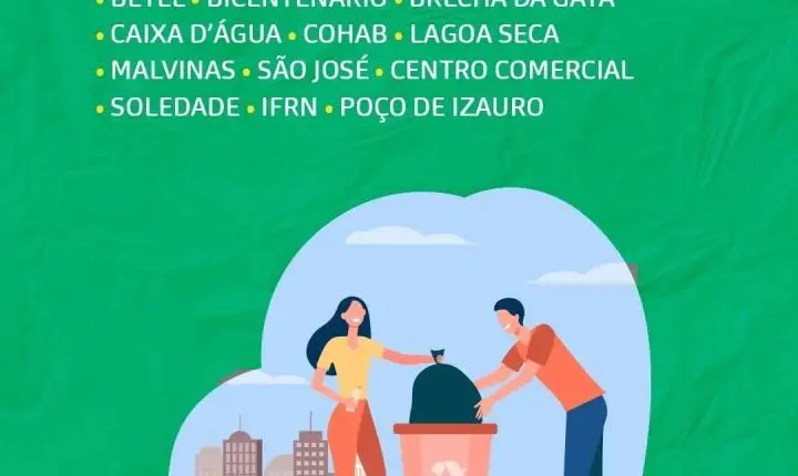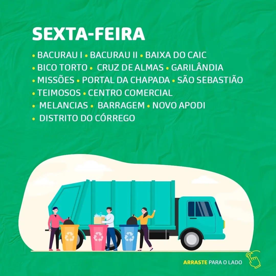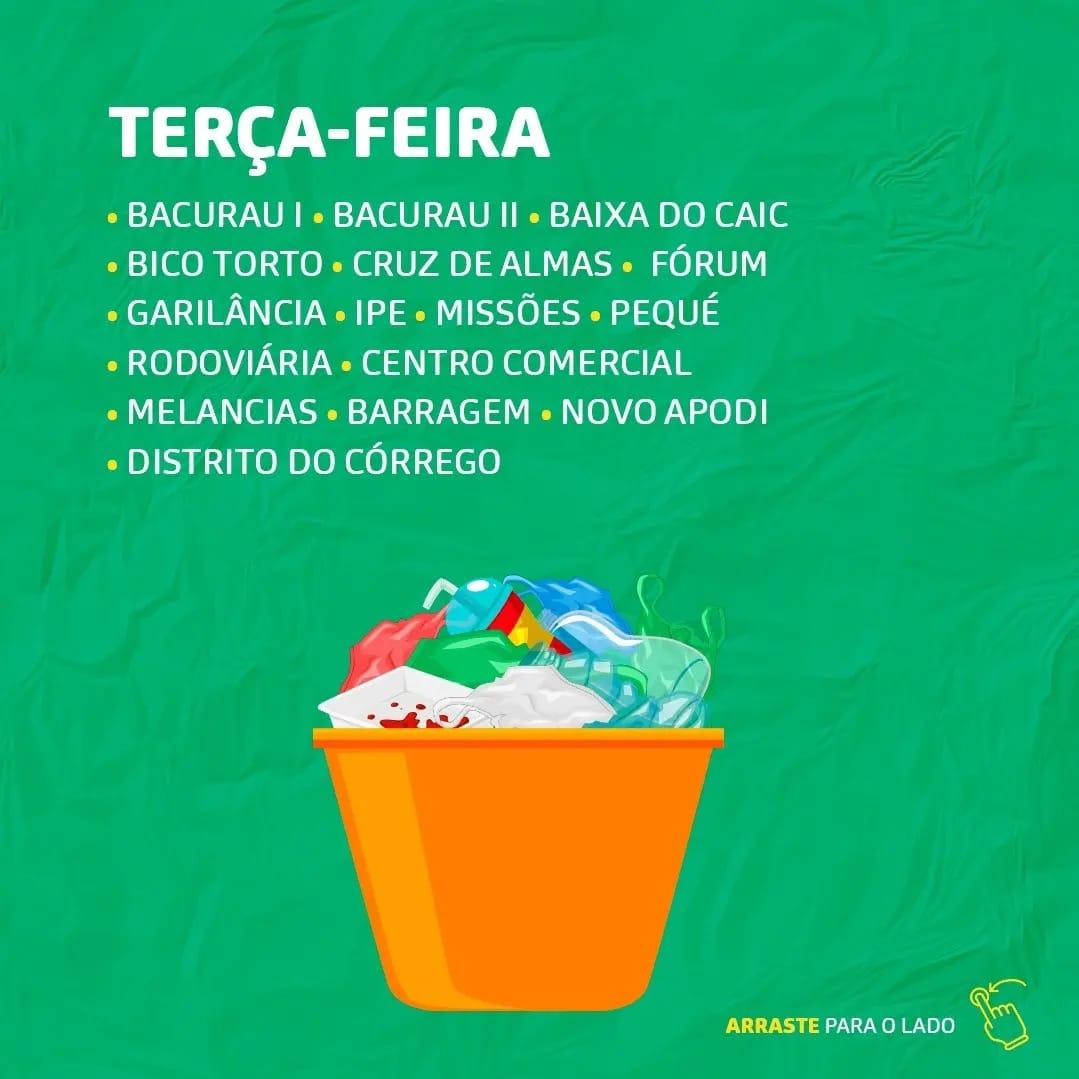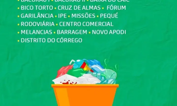 De acordo com dados cedidos pela Assessoria de Comunicação da Prefeitura Municipal de Apodi, o órgão público, por meio da Secretaria Municipal de Urbanismo, Transportes e Serviços Urbanos, apresenta o novo cronograma de coleta do lixo domiciliar. Acompanhe e coloque o seu lixo pra fora nos dias em que a coleta passa recolhendo em seu bairro.