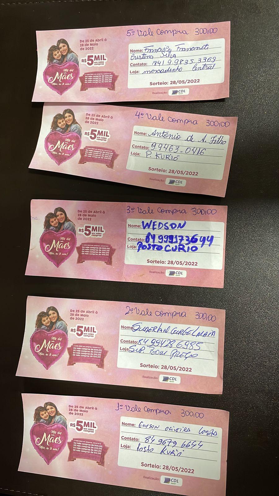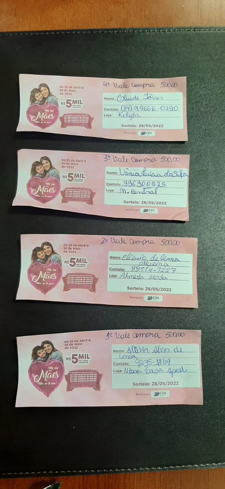 Os R$ 5 mil reais em vale compras foram divididos em quatro (04) vale compras de R$ 500,00; cinco (05) vale compras de R$ 300,00; quatro (04) vale compras de R$ 250,00; cinco vale compras de R$ 100,00.