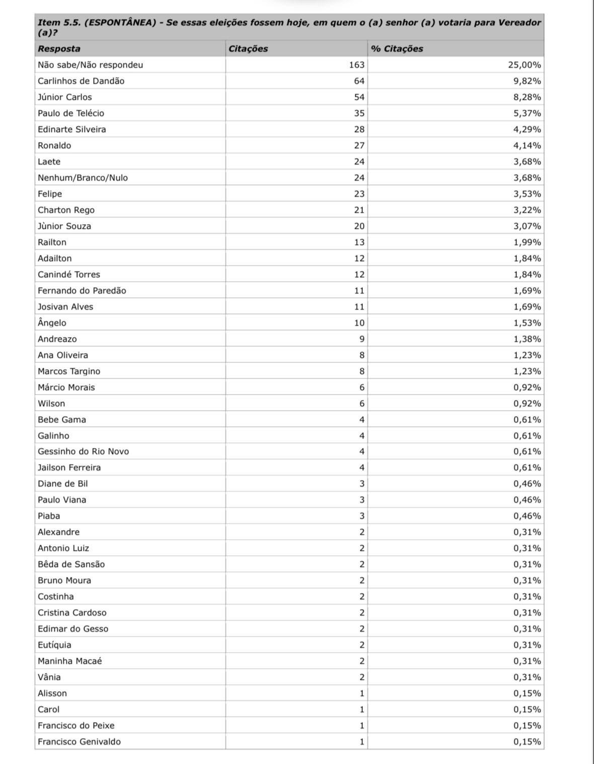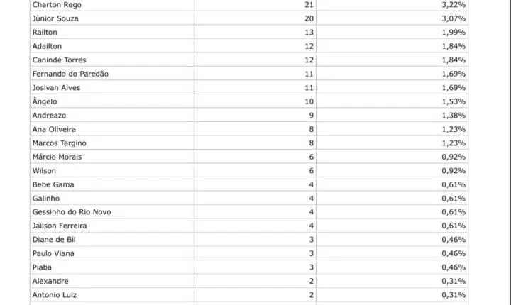 A pesquisa detalha as intenções de voto para os candidatos ao Legislativo municipal, revelando quem está na frente na disputa pelas cadeiras na Câmara de Apodi. No entanto, os resultados específicos para cada candidato ou a lista completa de nomes e percentuais não foram disponibilizados na descrição original.