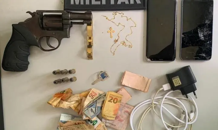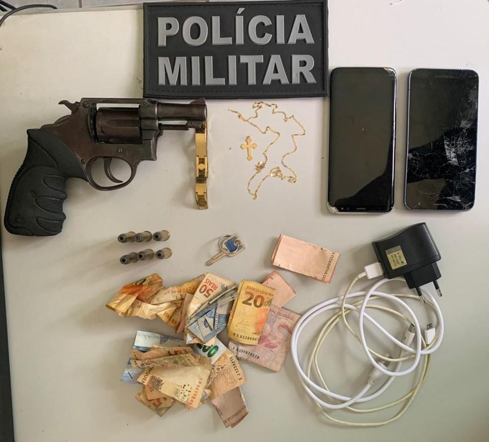 Com os bandidos, foi encontrado um revólver de calibre 38, seis munições intactas, dois celulares, uma corrente de ouro, além de uma quantia de R$ 548. Uma moto também foi apreendida.