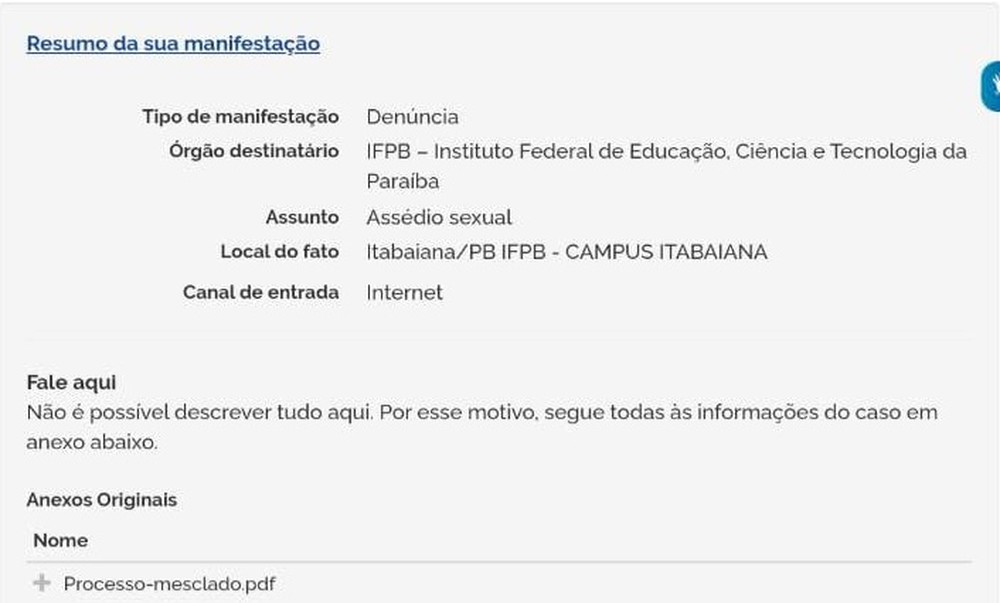 Em conversa com o g1, o jovem pediu para não ser identificado. O depoimento dele, os “prints” que ele reuniu ao longo dos anos de conversas que seriam do professor com as estudantes (muitas com conteúdo sexuais), as tentativas frustradas de denunciar o caso no âmbito interno do IFPB, tudo isso serve de base da denúncia que Ana Paula formalizou.