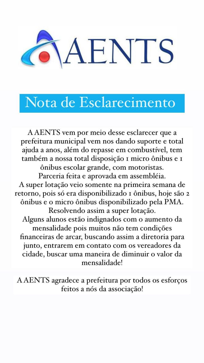Nós, Alunos associados a AENTS, estamos aqui por meio deste demostrando indignação com o poder público (Prefeitura e Vereadores) do nosso município, sobre a questão de recursos para ajudar, nós estudantes, com o deslocamento as cidades universitárias vizinhas! A prefeitura em 2 anos deu 3 mil de reajuste mensal em um período onde o preço do combustível duplicou, e vereadores simplesmente não veem a classe estudantil como uma prioridade no município, sendo que somos o futuro desta cidade!