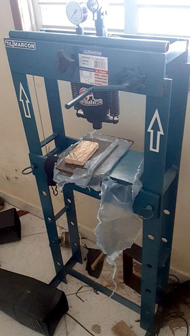 Durante a realização das buscas foram encontrados diversos objetos que caracterizam a manipulação e refino de droga, tais como: balança de precisão, seringas, substâncias químicas e até uma prensa profissional para embalar o produto ilícito.