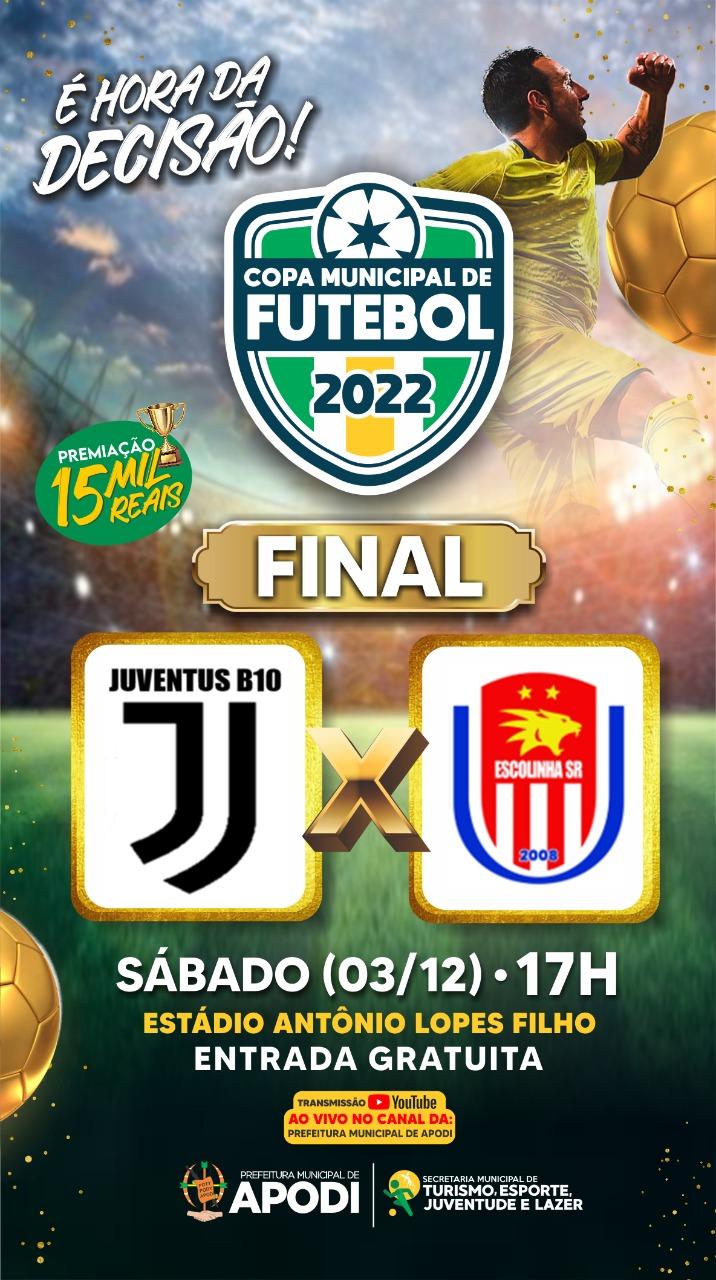 A final será disputada entre os times Juventus B10 e Escolinha SR. A partida ocorre ás 17 horas no Estádio Antônio Lopes Filho. A entrada é gratuita e a disputa também será transmitida pelo YouTube por meio do canal oficial da prefeitura: Prefeitura Municipal de Apodi.
