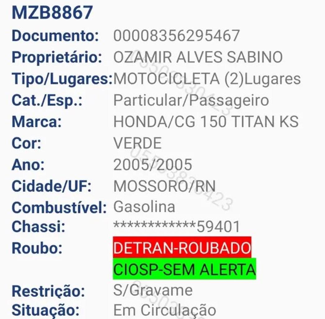 A equipe recuperou uma motocicleta Honda CG 150 de cor verde com placa do Rio Grande do Norte. A placa da moto recuperada é MZB-8867 e a mesma tem alerta de roubo no sistema do Detran-RN.