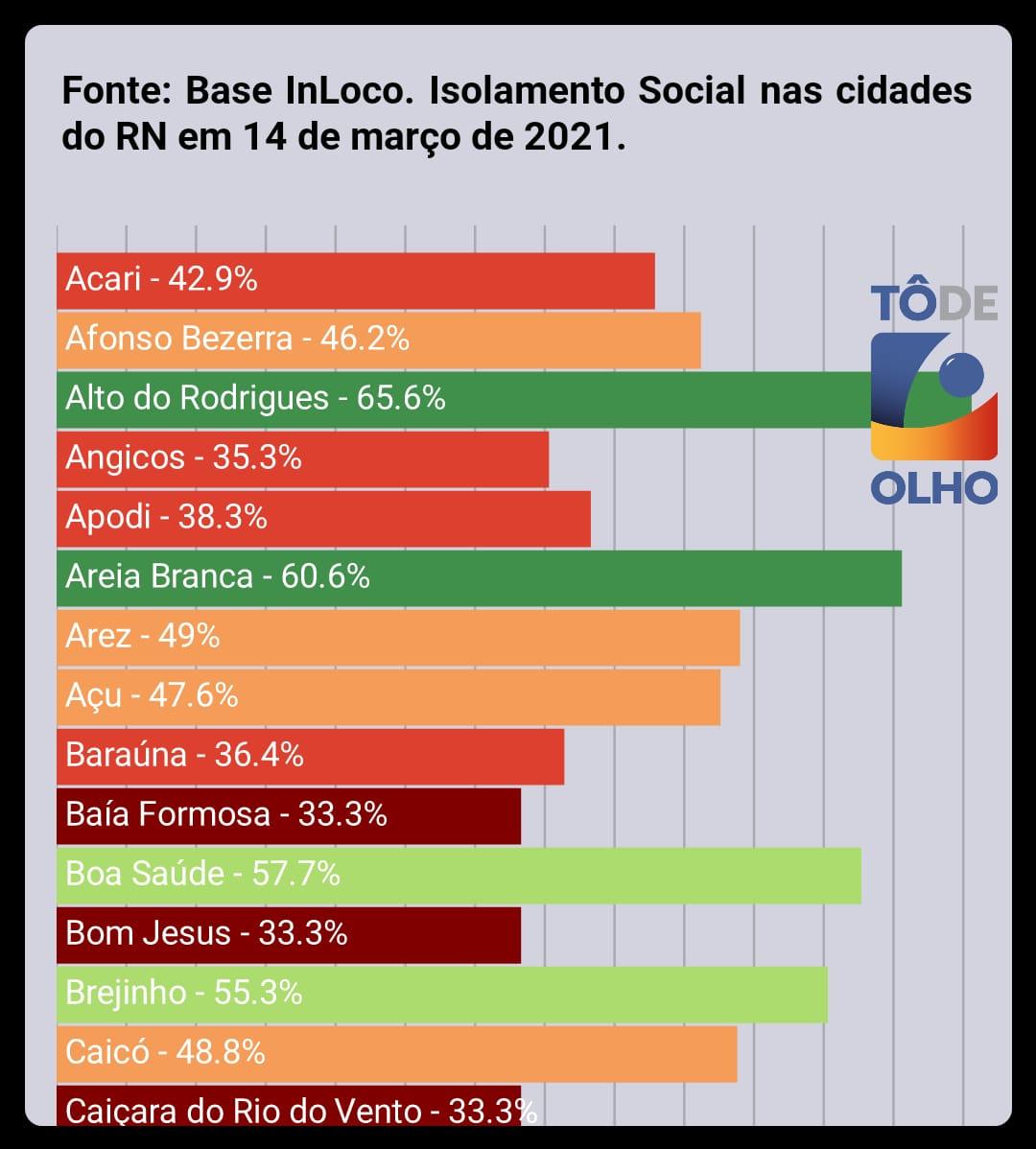 De acordo com a plataforma de monitoramento do Coronavírus no Rio Grande do Norte, "Tô de Olho" (link), publicados no dia 14 de março, a cidade de Apodi possui uma taxa de isolamento de apenas 38,3%.
