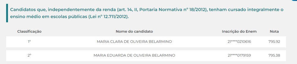 Maria Clara de Oliveira Belarmino, de 17 anos, e Maria Eduarda, de 18, passaram em 1º e 2º lugar nas vagas destinadas a alunos oriundos da rede pública.