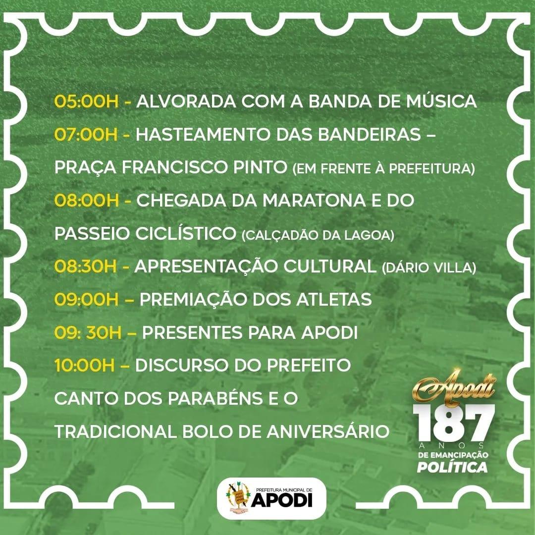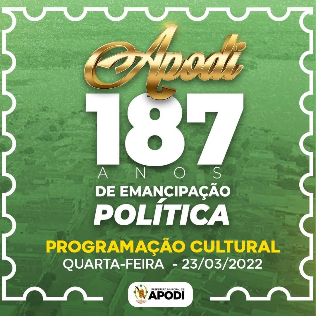 O município de Apodi celebrará na próxima Quarta(23), o aniversário de 187 anos de emancipação política da cidade. Para a ocasião, a prefeitura municipal preparou um evento em comemoração à data, que conta com alvorada com banda de música, hasteamento das bandeiras, presentes para Apodi e muito mais.