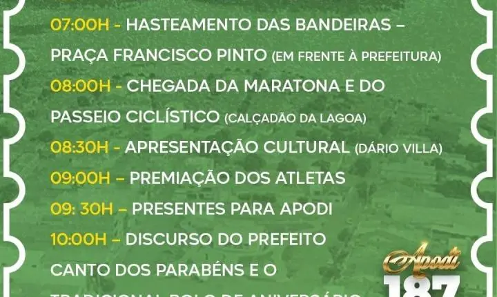 - 10h - Discurso do prefeito, canto dos parabéns e o tradicional bolo de aniversário.