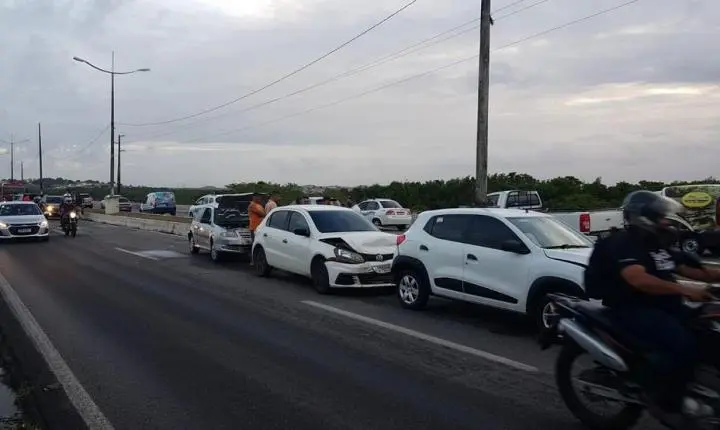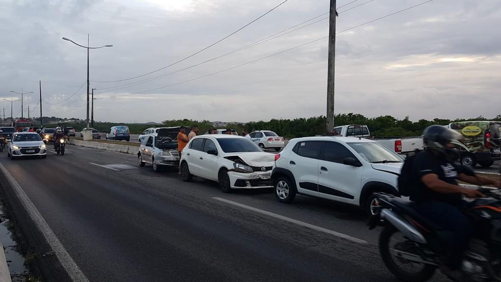 Nove carros se envolveram em um engavetamento na tarde desta quarta-feira (17) na Ponte de Igapó, no sentido da Zona Norte de Natal (veja o vídeo acima).