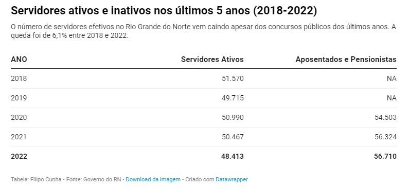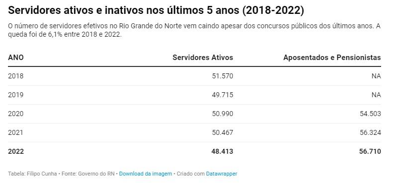 O Rio Grande do Norte tem hoje 48.413 servidores efetivos ativos. O número pode até parecer alto, mas é o mais baixo dos últimos cinco anos. Em 2018, o quadro mostrava que o estado tinha 51.570 servidores – 6,52% maior do que o quadro atual. Os dados foram enviados pelo Governo do Estado através de um pedido de Lei de Acesso a Informação.