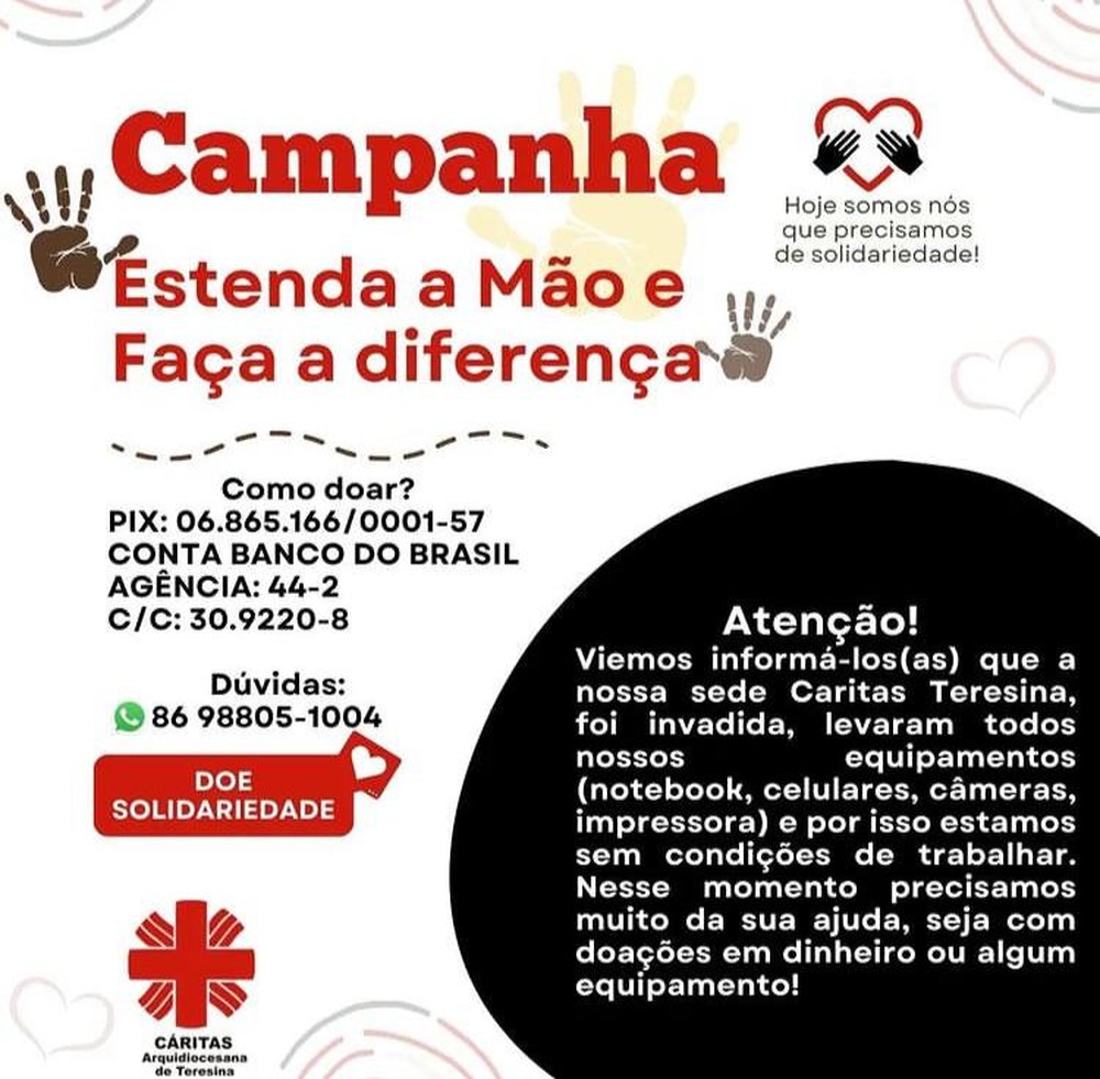 A sede da Organização Não Governamental Cáritas, localizada no bairro Cabral, Zona Norte de Teresina, foi invadida na manhã de domingo (10). De acordo com os seguranças que chegaram para o dia de trabalho, os suspeitos entraram na sala pela lixeira que tem na lateral do prédio, e levaram computadores, notebooks, microfone, caixa de som, data show, celulares e câmeras fotográficas.