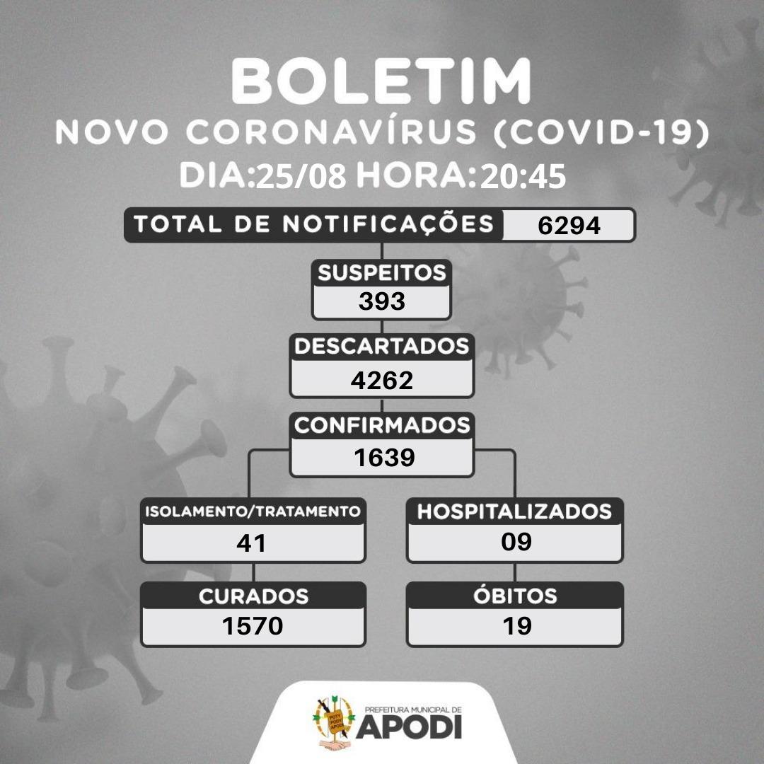 Nesta Terça(25) mais um Boletim sobre o novo Coronavírus (COVID-19) em Apodi, foi divulgado pela Prefeitura Municipal de Apodi. Segundo as informações do boletim, no qual mostrou um aumento no número de casos em tratamento.