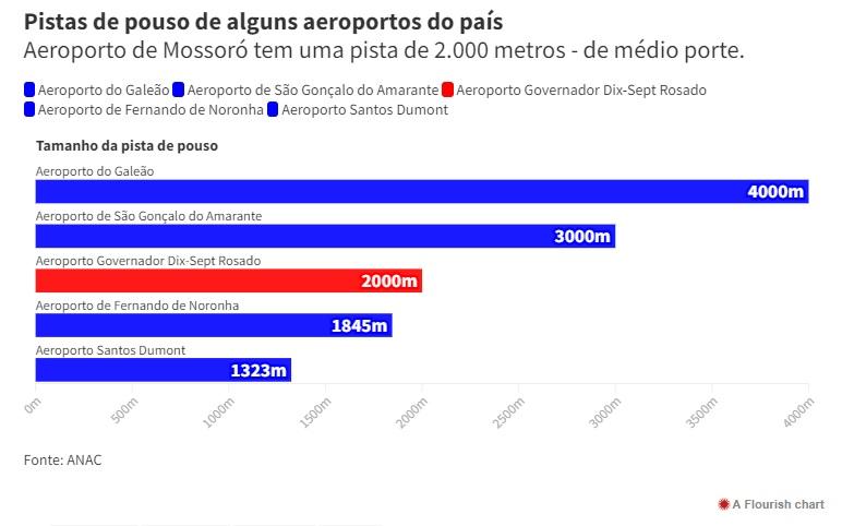 Só pra ter uma base de comparação, a pista principal do Aeroporto Internacional do Galeão tem 4.000 metros – o dobro da pista mossoroense. O Aeroporto de São Gonçalo do Amarante (11º na lista de maiores pistas) conta com um espaço de pouso de 3.000 metros.