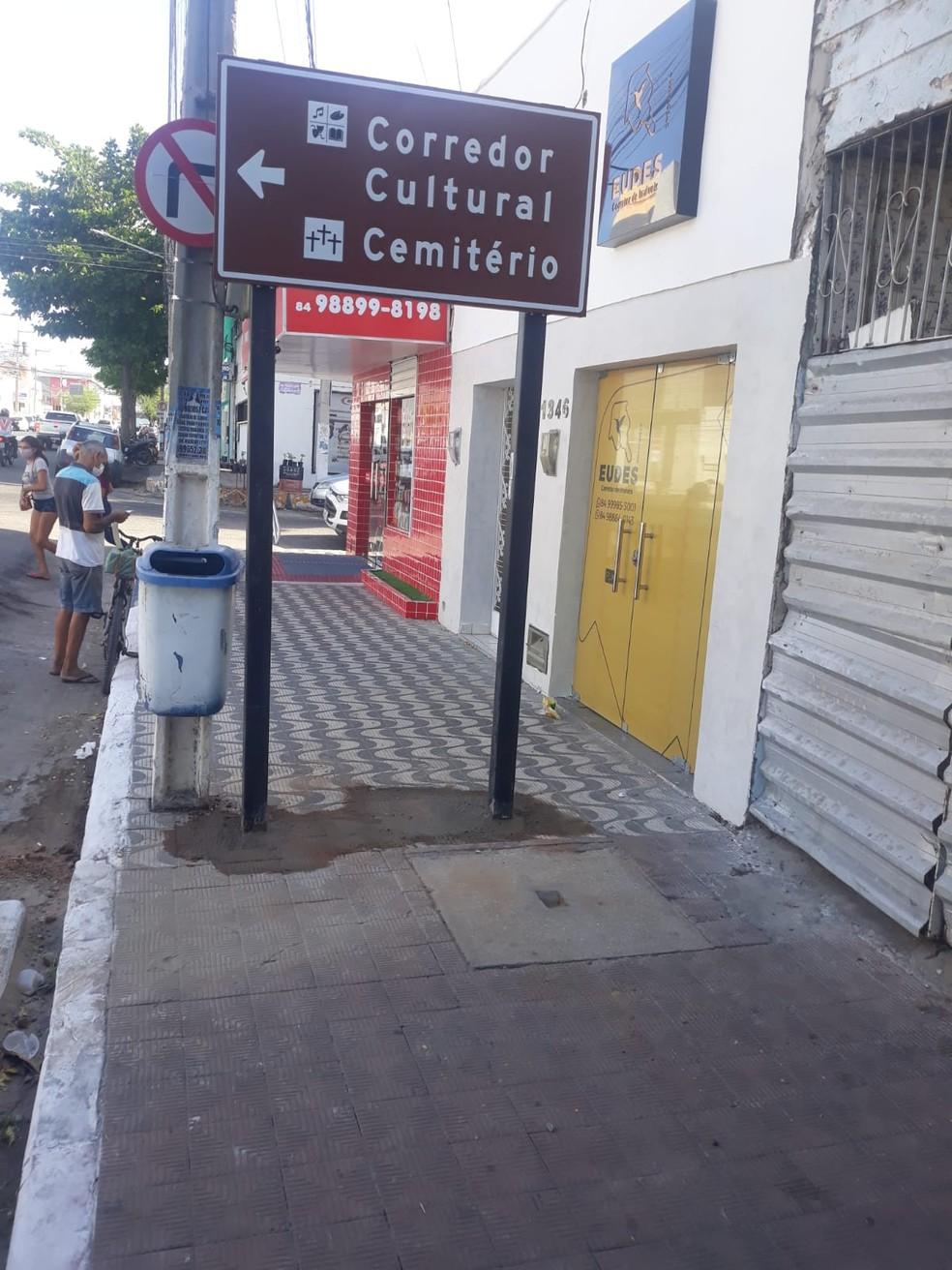 Uma das placas instaladas indicava o “cemitério” e o “corredor cultural” - ela foi colocada em uma calçada na Avenida Alberto Maranhão e dificultava a passagem dos pedestres no trecho.