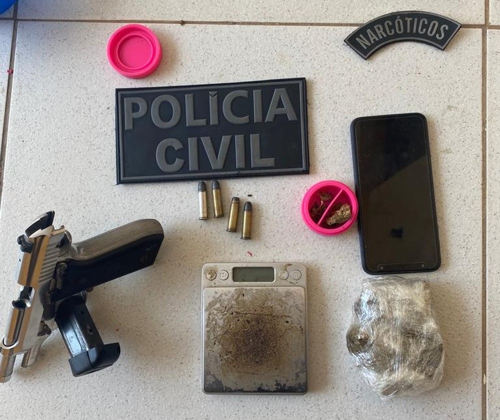 Uma pistola, aparelhos celulares e porções de maconha também foram apreendidos.
