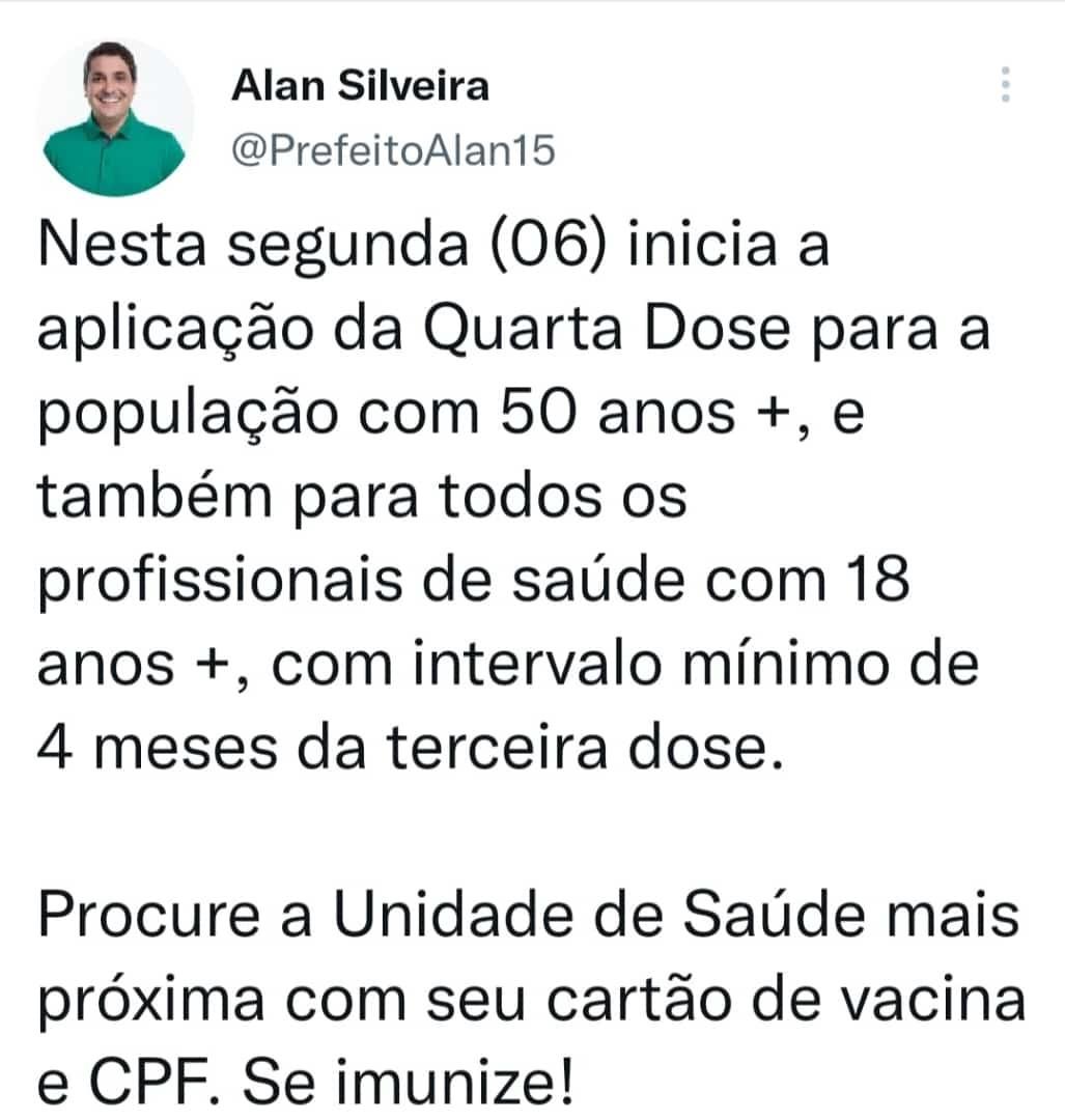Em seu comunicado, Alan Silveira, divulgou o início da aplicação da quarta dose da vacina contra Covid-19 para a população com 50 anos ou mais. Além disso, os profissionais de saúde também pode procurar a vacina.