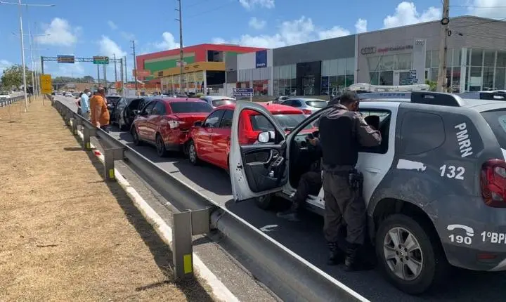 Um engavetamento envolvendo seis carros, entre eles uma viatura da Polícia Militar, aconteceu na manhã desta terça-feira (9) na BR-101, na Grande Natal.