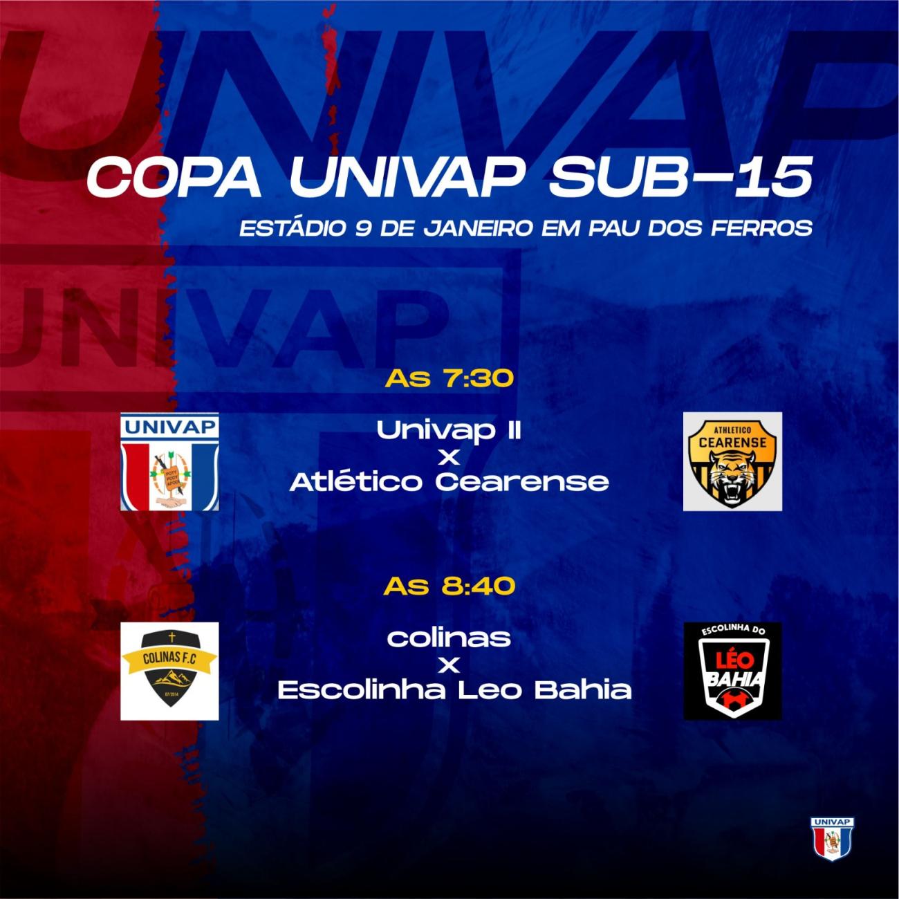Ainda na Quinta(08), o time UNIVAP deve enfrentar o Atlético Cearense, em disputa também pela Copa Univap Sub-15. A partida ocorre a partir das 7 horas e meia em Pau dos Ferros.